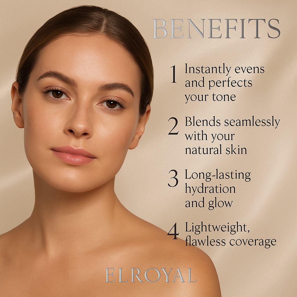 ELROYAL was designed forevery woman — and every skin type. Whether your skin is dry, oily, combination, or sensitive, the formula’s balance of light oils and hydrating molecules ensures comfort and long wear.